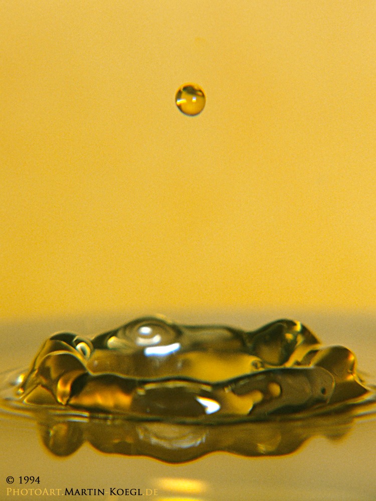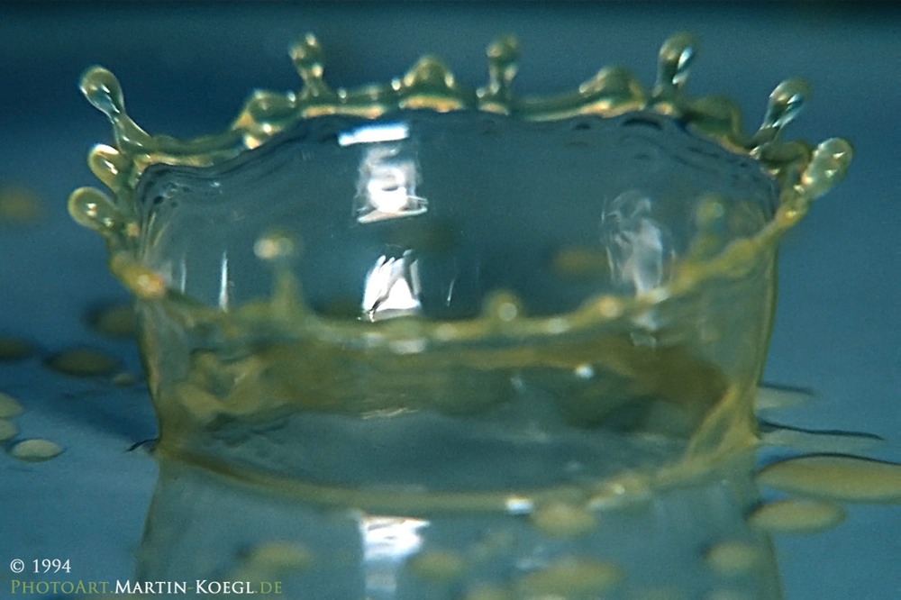 Auf dieser Seite möchte ich Euch ein paar Bilder meiner frühen Versuche aus dem Jahr 1994 zeigen. Ich habe damals bereits mit der Tropfenfotografie begonnen, und auch schon mit verschiedenen Flüssigkeiten (Wasser, Milch, Säfte), Hintergründen, Formen und Zeitpunkten experimentiert. Ein paar der damaligen Fotos seht Ihr unten. Neben den klassischen Säulen und Kratern habe ich auch mit Kronen experimentiert, abstrakte Formen erzeugt und sogar einen TaT (wobei ich zugeben muss, dass dieser nur durch Zufall entstanden ist und ich das Potential dieser Formen damals nicht erkannt habe).